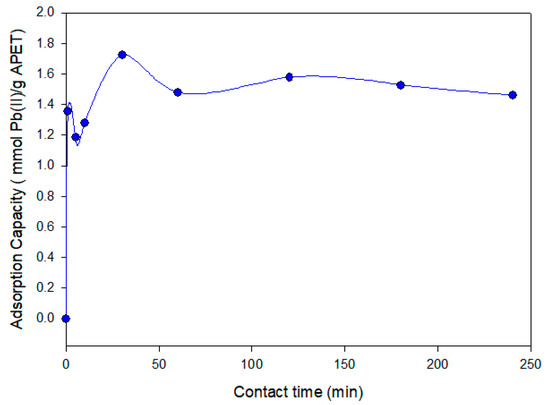The results of the pH-effect experiments for Pb(II) adsorption are shown in Figure 5. At pH 2.0, there was low Pb(II) adsorption (below 0.1 mmol Pb(II)/g APET) because of the competitive adsorption between the prevalently available H+ and the Pb(II) ions. At a lower pH, amino (–NH2) groups are inclined to bind with hydrogen ions to form –NH3+. However, more binding sites (–NH2) are available with increasing pH, leading to higher adsorption capacities [40]. A high increase of the adsorption capacity in the pH range between 6.0 and 8.0 achieved equilibrium at around pH 8.3. At pH 8.0, the competitive adsorption of the OH− ions had less effect and no precipitation of Pb(II) was observed, reaching a maximum adsorption capacity of 1.62 mmol Pb(II)/g APET. Experimentally, Pb(II) precipitation was observed with a pH greater than or equal to 10, producing a decrease in the adsorption capacity. At a higher pH, the precipitation of metal ions appeared according to the solubility constant (Ksp) of such compounds [40]. In order to analyze the samples correctly and to quantify the metal content adsorbed on the material, 10 mL of 1.0 M HNO3 was added to the suspension and the precipitate was dissolved. Then, we ensured that the quantification of the metal ions was complete and that the obtained results were completely reliable.