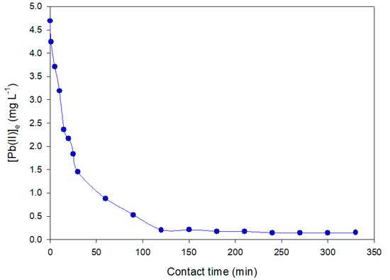 In order to prove the APET adsorption capacity in a continuous mode, a solution of 5 mg L−1 of Pb(II) was pumped throughout a multilayer cartridge of the APET nanofibers, achieving an adsorption of up to 97% of Pb(II) in the mono-elemental synthetic solution. The APET mats had the ability to extract virtually all of the Pb(II), showing a high reactivity of the nanofibers in the presence of Pb(II). The steady state was reached at around 240 min. The results in Figure 7 suggest that the APET nanofiber mats are a potential system for heavy metal removal from contaminated effluents.