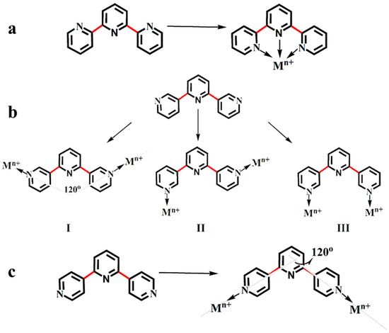 Three types of terpyridine: 2,2′:6′,2′′-terpyridine. (a) 3,2′:6′,3′′-terpyridine; (b) 4,2′:6′,4′′-terpyridine; (c) the directional metal-binding properties of them.