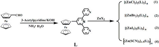 Based on the aforementioned considerations, 4′-ferrocenyl-3,2′:6′,3′′-terpyridine and ZnX2 (X = Cl, Br, I, and SCN) have been selected as the ligand and the metal ion nodes, and four novel complexes, [(ZnCl2)2(L)2]n (1), [(ZnBr2)2(L)2]n (2) and [(ZnI2)2(L)2]n (3), and {[Zn(SCN)2]1.5(L)3}n (4), have been synthesized under similar conditions, as shown in Figure 2. Their structural features have been systematically investigated, and their structural transformations from one-dimensional (1D) polymer chain to two-dimensional (2D) network under the influence of the coordination anions have been studied. In addition, the optical band gaps of the ligand and the complexes have been confirmed by the Kubela-Munk-transformed diffuse reflectance spectra.