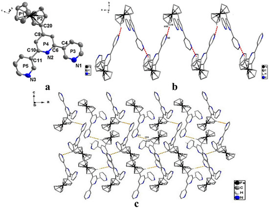 A cyclopentadienyl ring interacts with a pyridine ring in a neighboring molecule through C–H···N interaction to yield a 1D “zigzag” chain structure, in which the formation of the 1D chain is similar with that of the 4′-ferrocenyl-4,2′:6′,4′′-terpyridine [21]. The C16–H16 and H16···N3 bond lengths are 0.907 and 2.667 Å, and the angle of C16–H16···N3 is 156.77°. The 1D chain forms 2D structures through C–H···N interactions, and the C24–H24 and H24···N1 bond lengths are 0.941 and 2.729 Å and the angle of C16–H16···N3 is 170.08°.
