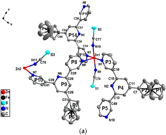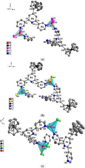 The syntheses are summarized in Figure 2. The ligand was synthesized using the one-pot method starting from ferrocenecarboxaldehyde and 3-Acetylpyridine in EtOH in the presence of KOH and NH3 in a similar way to the reported work [11,18,21]. The crude product was purified by recrystallization from EtOH, The ligand was prepared with satisfactory yield of 47.2% and systematically characterized with 1H/13C NMR, FI-IR spectrum, mass spectrum and elemental analysis. The crystal of the ligand was grown from a DCM/Benzene solution of the compound by slow evaporation. The preparations of complexes 1–4 were performed in a similar way to reported work [11,18,21] by layering of MeOH and CHCl3 solution of ZnX2 and the ligand, respectively, and their crystals were formed in about 10 days in high yields.