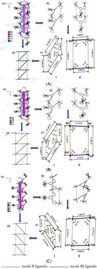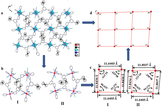 As shown in Figure 7, ZnII ions are almost on a straight line along horizontal and vertical directions in the complex, and are arranged in the order of ···Zn2···Zn1···Zn1···Zn2···. There are two modes of hole-structure units, I and II, in the polymeric network. Furthermore, two modes of hole-structures form two types of quadrangle, I and II, and quadrangle I is approximately a parallelogram. Two types of quadrangle construct the network and arrange in the order of ···I···II···II···I··· along horizontal and vertical directions in the network.