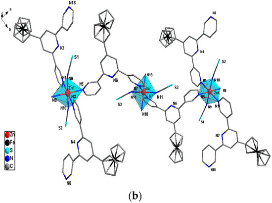 As shown in Figure 4, the asymmetric unit in the three complexes consists of two independent ZnII ions and two ligands, and the ZnII ion is tetra-coordinated with a slightly distorted tetrahedral geometry. Two coordination sites are occupied by two outer-pyridyl N atoms from different ligands and the other two coordination sites are occupied by halogen atoms (Cl, Br or I). The selected bond parameters of the three complexes are listed in Table S1. The central pyridiyl N atom of the ligand is not coordinated with the metal ion, just as the described above, and non-coordination of the central pyridine ring is typical of the 3,2′:6′,3′′-terpyridine and its derivatives [2,11,18]. Of the three possible conformations shown in Figure 1b, it is interesting that the ligands in the three complexes adopt two different binding modes, cis-trans (mode II) and cis-cis (mode III), for which there is only one binding mode (cis-trans) in the complex of the ZnBr2 with the ligand in Housecroft’s works [18]. Compared with the free ligand, the distortion of the two modes of ligands in the three complexes all have changes of various degrees. In particular, the mode II ligands distorted largely, and the collection distances of rings and dihedral angles of complexes 1–3 are listed in Table S2. The ligands act as two types of bridges that connect the ZnII ions to form 1D double-stranded metal ion left-handed helical polymer chains along the a direction, as shown in Figure 5a.