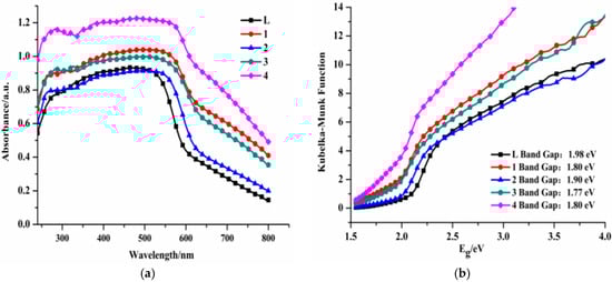 Solid state UV-vis absorption spectra (a) and Kubelka-Munk diffuse reflectance spectra (b) for L and complexes 1–4.