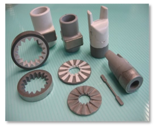 In a FGM, the properties change gradually with position [7], which generates new fields of application. The combination of two or more materials in graded microstructures such as ceramic–metal composites results in innovative, multi-functional property combinations, such as hard and ductile, electrically or thermally conductive and insulating, magnetic and nonmagnetic [8]. Such materials could be used to create conceivable applications in a variety of industrial and medical fields, such as for example, cutting tools, wear-resistant components, energy and fuel cell components, and bipolar surgical tools [9,10,11,12,13,14]. Figure 1 shows the metal–ceramic components for different applications manufactured at our group “Shaping” of the Fraunhofer IKTS (Institute for Ceramic Technologies and Systems) by two-component ceramic injection molding (2C-CIM) [14]. Furthermore, the manufacturing of two-color components is possible with 2C-CIM, which was demonstrated by Fraunhofer IKTS (FhG-IKTS) as well. (Figure 2).