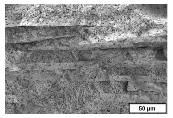 Components with different porosities combine different properties in the gradient structure regarding thermal conductivity, heat capacity, density, mechanical strength, and elastic modulus, which results in improved thermal shock properties [15]. In the case of open porosity, it is possible to generate selective filters that are able to filtrate by tailored pore sizes in a complex or small single component. Figure 3 shows the SEM image of a cross-section of a sintered MgO–ZrO2 component with graded porosity, and Figure 4 shows the crack surface after a crack deflection during a bending test, which occurred due to the graded microstructure and varied Young’s modulus or rather stress distribution [8]. Both samples were manufactured at Fraunhofer IKTS.