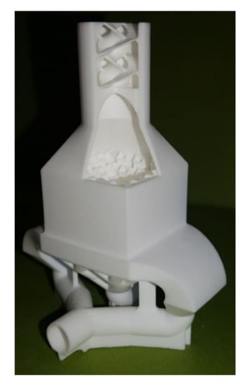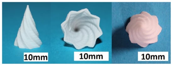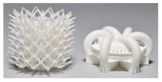 AM technologies make it possible to produce components with extremely complex geometry that cannot be attained by any other shaping technique without the use of tools, because it is “the general term for those technologies that based on a geometrical representation creates physical objects by successive addition of material” [16]. For processing ceramic materials, the technical application of AM technologies has been limited so far. However, ceramics have been studied in AM processes ab initio, with the development of different AM technologies over the last 25 years [17,18]. All of the established AM technologies have also been tested for ceramic materials [19,20,21,22,23,24,25,26,27,28,29,30,31,32,33,34,35,36,37,38,39,40,41,42,43,44,45]. AM technologies can be classified according to the state of the material that is used—powder materials, liquid materials and solid materials [46,47]—or according to the kind of material deposition and solidification [48]. Lithography-based ceramic manufacturing (LCM) enables the AM of dense alumina (Figure 5 and Figure 6) and zirconia components with extraordinary complex geometries [24,25,26,49,50].