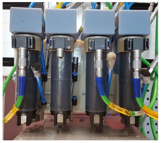 A special device was developed in Vermes, Germany that combines several supply containers and mechanical and electronic micro dispensing units (Figure 8). Hence, it could be used for the spatially resolved deposition of different materials, including supporting structures, in the same component. The micro dispensing units work with a nozzle orifice diameter of 160 μm. A piezo-driven hard metal piston moves up and down in the nozzle chamber to jet single droplets instead of filaments, which are deposited with extruder-like systems [71,72]. In our study, we used a maximum frequency of 100 Hz, but a frequency up to 3000 Hz is possible with the used system.