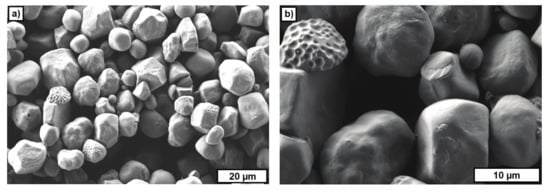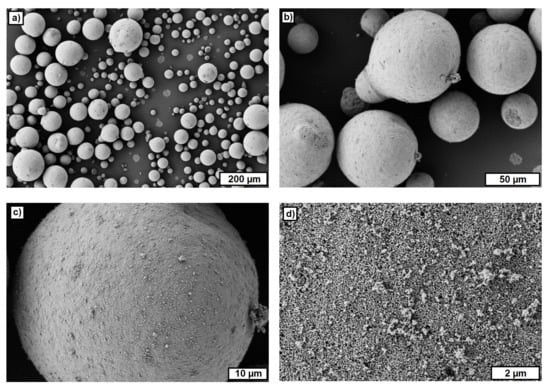 The measured average particle size (d50) of the zirconia powder was 0.37 μm by about one order of magnitude larger than the average particle size, as stated by Tosoh (d50 = 0.04 μm). FESEM images showed that the untreated powder consisted of very large granulates (diameter up to 100 μm) that were crushed during the ultrasonic treatment before the laser diffraction (Figure 9). Still, the applied treatment was insufficient regarding the deagglomeration of all the particles. However, during the feedstock preparation, very high shear forces were realized, which should deagglomerate all particles.