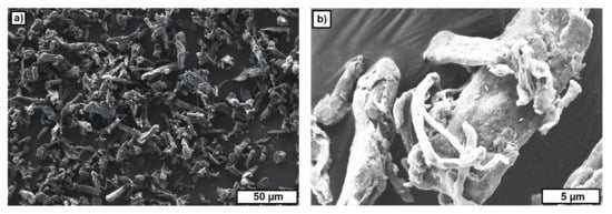 Figure 10 and Figure 11 show FESEM images of two materials used as a PFA. ARBOCEL UFC100 bases on cellulose fibers and the particles have a fiber fragments-like shape (Figure 10). The particles of the PS powder have a polyhedral-like shape (Figure 11). The particle size investigated on FESEM images varied between 5–20 μm.