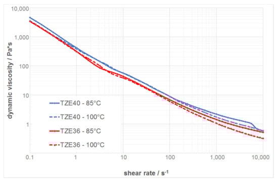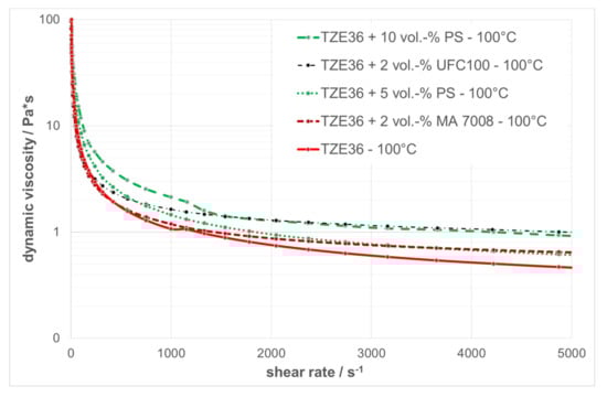 Figure 13 shows the dynamic viscosities as a function of the shear rate at a temperature of 100 °C for the different suspensions with and without PFA. The suspension without any PFA has the lowest viscosity, and by adding PFA, the viscosity increases due to the lower solid content compared with those loaded with PFA. However, all of the suspensions show a shear thinning behavior with a dynamic viscosity of 1 Pa·s or lower at a shear rate of 5000 s−1. Moreover, the course of the curves resembles those of previous experiments with printable feedstocks, which therefore can be utilized for T3DP [68]. Table 2 summarizes the measured viscosities of the suspensions at different shear rates and temperatures.