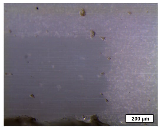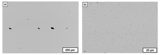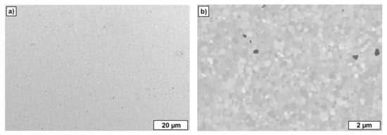 However, not every one of the used materials operated as a PFA. Figure 18 shows the FESEM images of sintered zirconia components additively manufactured by T3DP, and a suspension with 2 vol.-% of CERETAN MA 7008 as PFA. After sintering, only a few pores can be detected, which are located in the image in an almost horizontal row. These are most likely resulting from trapped air bubbles between two layers during the manufacturing process.