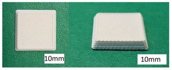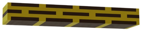 To demonstrate the additive manufacturing of zirconia-based 4D-components, we manufactured components with a brick wall design. Figure 19 shows a Computer Aided Design (CAD) drawing of the design. The brighter areas were manufactured with 5 vol.-% PS as the PFA, and the dark areas were manufactured with the pure zirconia suspension (36 vol.-% solid load, no PFA). As previously discussed, CERETAN MA 7008 was not suitable as PFA, and for ARBOCEL UFC100, only 2 vol.-% could be added to the suspension without significantly increasing the viscosity. The suspension with 5 vol.-% PS as PFA already formed a clearly detectable number of pores; therefore, it was considered sufficient for the mere demonstration of producing a 4D component. The resulting defect-free sintered components are shown in Figure 20.