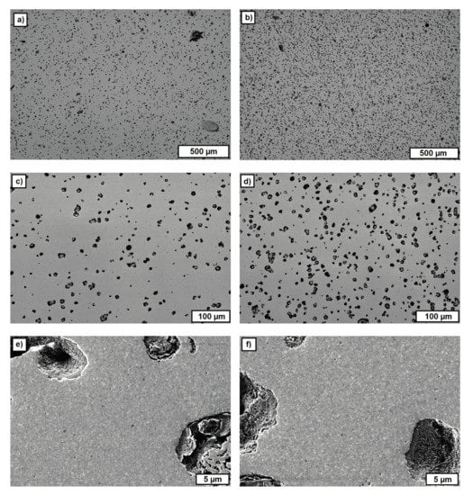 Figure 17 summarizes the FESEM images from regions of the inner core of the sintered single-material test components additively manufactured by T3DP with the suspensions that included 5 vol.-% PS (left) and 10 vol.-% PS (right) as PFA, taken at different magnifications. The images show a homogeneous distribution of the single pores, with a nearly round shape resulting from the polyhedron-like shape of the PS powder as PFA. The average porosities calculated with ImageJ on five images (200 × magnification, 2nd line in Figure 17) each are 5.02 ± 0.43% and 10.72 ± 0.87%, respectively. These correspond almost exactly to the content of added PFA in the suspensions (5 vol.-% and 10 vol.-%).
