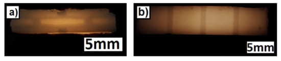 Sintered zirconia 4D component in front of a light spot with two different microstructures (darker areas: porous; brighter areas: dense); (a) side view (section); (b) top view.