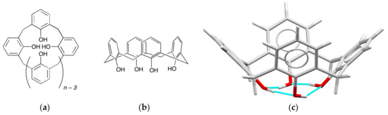 (a) Structure of calix[n]arene; (b) Three dimensional representation of the calix[4]arene in the cone conformation; (c) A representation of a structurally characterised calix[4]arene in the cone conformation [10], highlighting the hydrogen bonds (in blue) between the phenol O atoms.
