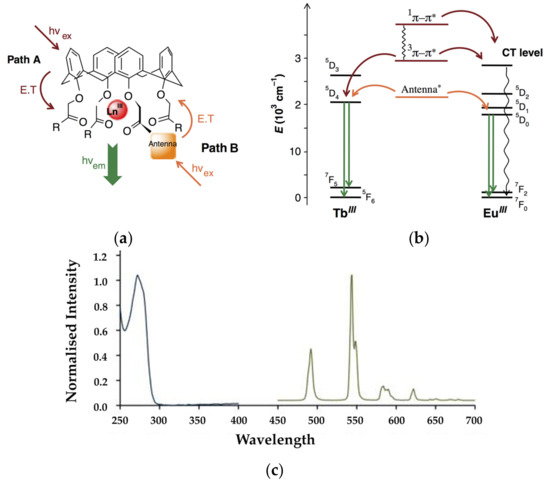 (a) Lanthanide emission sensitisation process in a typical lanthanoid calixarene complex. Path A for Ln = Tb and Path B for Ln = Eu. (b) Jablonski diagram for the sensitisation of lanthanide luminescence using Path A (in red) or Path B (in orange); (c) Typical absorption (blue), and emission spectrum (green) for a terbium calixarene complex showing the line-like emission from the lanthanoid. Figure reproduced with permission of Taylor & Francis Ltd. (www.tandfonline.com) from [14].