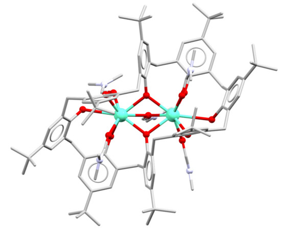 The first lanthanoid calixarene complex was reported in 1987, and was a bimetallic Eu complex of p-t-butylcalix[8]arene (Figure 3) [17]. The complex is neutral, so the calixarene retains two phenolic protons. The metal atoms are bridged by two phenolate O-atoms and a solvent Dimethylformamide (DMF) O-atom. The metal atoms are also each coordinated to three phenol O atoms, and two solvent DMF O atoms, giving rise to eight-coordination of each metal centre. Subsequent reports showed that similar complexes could be obtained across the lanthanoid series, as DMF or DMSO solvates [18,19].