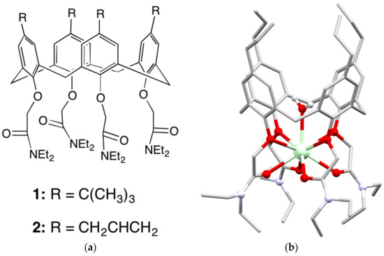 - Chinta, J.P.; Ramanujam, B.; Rao, C.P. Structural aspects of the metal ion complexes of the conjugates of calix[4]arene: Crystal structures and computational models. Coord. Chem. Rev. 2012, 256, 2762–2794. [Google Scholar] [CrossRef]