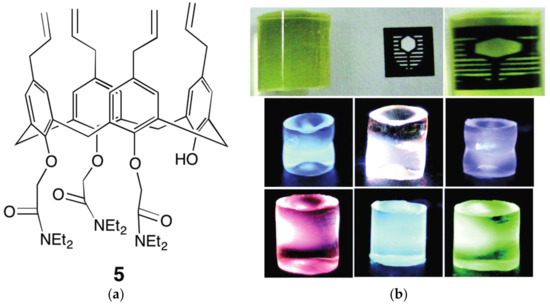 (a) The trisamide substituted p-allylcalix[4]arene 5; (b) examples of the polymer monoliths showing the transparency of the matric (top), and the variation of emitted colours obtained by loading single lanthanoid salts or mixtures. Reproduced by permission of The Royal Society of Chemistry from [35].