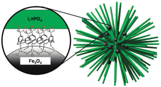 A schematic representation of the nanoball structure of LnPO4 nanorods (Ln = La, Eu, Tb, Ce) held together by p-sulfonato-calix[6]arene stabilised Fe3O4 nanoparticles. Reproduced by permission of The Royal Society of Chemistry from [44].