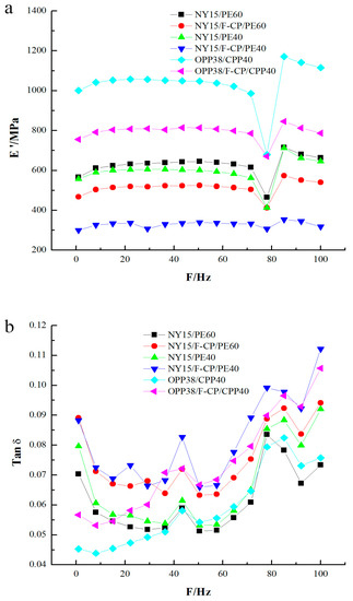 Figure 4a shows the dynamical storage modulus, and Figure 4b represents the tangent of the loss angle of various composite films as a function of the test frequency. It can be seen in Figure 4a that the addition of ceramic powder reduced the storage modulus of the composite material and reduced the stiffness, resulting in a decreased damping and shock absorption performance. Taking the NY15/cFIR/PE60 and NY15/cFIR/PE40 films as examples, Figure 4a shows that, with a decrease in the thickness of the cFIR composite films, the storage modulus and the stiffness are reduced accordingly. This is consistent with previous experience in practical applications. As can be seen from Figure 4a, the storage modulus of the OPP/CPP film is bigger than that of the NY/PE film. The storage moduli of these composite films have a linear relationship in the low-frequency region (0–70 Hz) for all samples. Figure 4a shows a significant fluctuation in the high-frequency region (70–100 Hz), and the linear relationship is no longer valid. At 80 Hz, the storage modulus is gradually reduced. There is a peak at a frequency above 80 Hz, and the damping properties of the composite at this point are minimal. Therefore, 80 Hz may be a critical point for the damping properties of these composite films, showing the best damping characteristics due to the fact that the films can maximally convert kinetic energy into heat loss at this frequency.