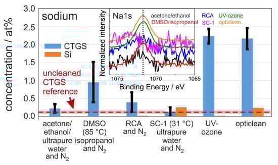 Mean value of sodium concentration after the respective cleaning procedure measured with XPS (Al-source with neutralizer) on the CTGS surface and on Si reference. The red dashed line represents the mean sodium values of the unclean CTGS reference samples of about 0.14 at %. The light red stripe indicates the corresponding standard deviation of 0.04 at %. The inset shows the normalized Na1s spectra of one set of samples. The black dotted line marks the theoretical position of the Na1s peak.