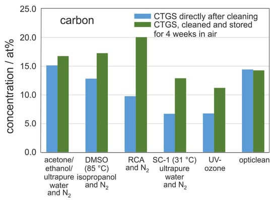 It is important to note that the strongest increase in carbon contamination on the CTGS substrates is observed for samples cleaned with RCA procedure. In this case, the carbon concentration doubled from 10 at % C directly after cleaning to 20 at % C after 4 weeks of storage in air, which is the highest value for all samples, indicating a strong activation of the substrate surface for hydrocarbon adsorption. In order to reduce the re-contamination of a silicon substrate surface, Leopold characterized various additives for the RCA procedure [2]. The other cleaning procedures (UV-ozone, SC-1 at 30 C, DMSO cleaning) showed an intermediate increase of 4–6 at % of carbon.