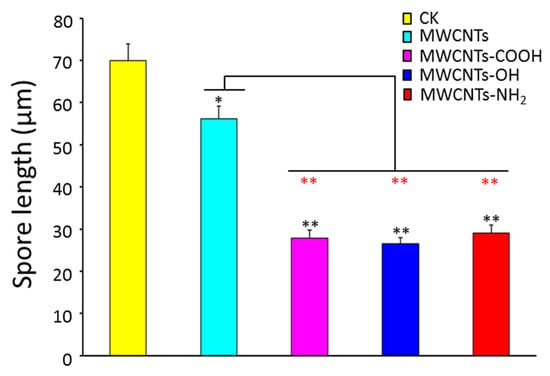 Effects of multi-walled carbon nanotubes (MWCNTs) modified with different groups (500 μg·mL−1) on the spore length. Error bars represent the standard deviation (N = 4). Black asterisk indicated significant differences within group consisting of Control (CK), MWCNTs, MWCNTs-COOH, MWCNTs-OH, and MWCNTs-NH2 based on analysis of variance using the GLM procedure with SAS system. GLM, General Linear Model; SAS, Statistics Analysis System. Red asterisk indicated significant difference between MWCNTs, MWCNTs-COOH, MWCNTs-OH, and MWCNTs-NH2, determined as described above. * p < 0.05; ** p < 0.01.