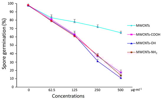 For spore germination studies, F. graminearum spores were treated with CNTs according to a previous report [19]. Briefly, an 80 µL suspension of spores was mixed with 80 μL of different types of MWCNTs (–OH, –COOH, and –NH2) in the tubes to obtain MWCNTs at a final concentration of 62.5, 125, 250, and 500 μg·mL−1, respectively. Control samples containing 80 µL suspensions of spores were mixed with 80 µL DI water. The 30 µL mixture with a different concentration of MWCNTs was transferred onto a concave slide for further incubation at 28 °C for 5 h in complete darkness. Five concave slides were prepared for each treatment, and the mean germination values were calculated based on five measurements. Photomicrographs were taken with a digital camera connected to a Leica microscope. For each treatment, one hundred spores were used to measure the average spore length. The spore germination rate was calculated as follows:
