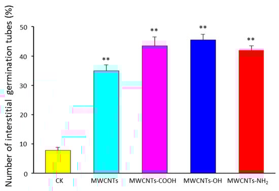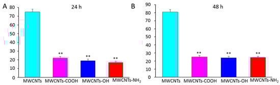 Effects of different functional MWCNTs on the germination rate at (A) 24 h and (B) 48 h, respectively. Error bars represent the standard deviation (N = 4). Where appropriate, statistical significance is indicated: ** p < 0.01.