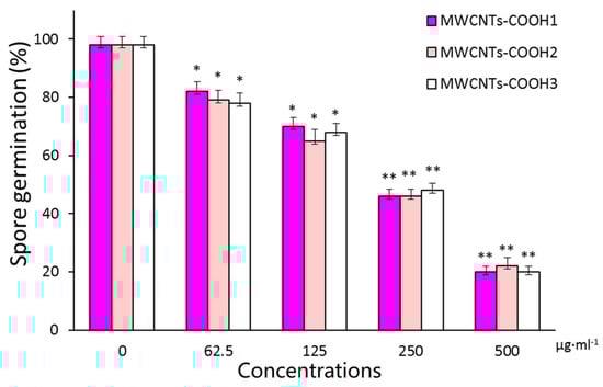 Antifungal effects of different length of MWCNTs-COOH on the germination rate of spores. Error bars represent the standard deviation (N = 4). Where appropriate, statistical significance is indicated: * p < 0.05; ** p < 0.01.