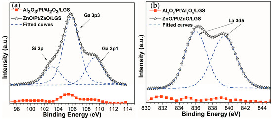 XPS (X-ray photoelectron spectroscopy) spectra of (a) Ga 3p, Si 2p and (b) La 3d5 for ZnO/Pt/ZnO/LGS and Al2O3/Pt/Al2O3/LGS samples after annealing at 1000 °C for 1 h.