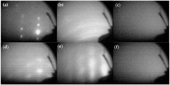 RHEED (reflected high energy electron diffraction) patterns of (a) a LGS substrate, (b) ZnO directly deposited on LGS. RHEED patterns have also been obtained for (c) an Al2O3 barrier layer, (d) ZnO, (e) Pt, and (f) the Al2O3 protective layer during the process of depositing the Al2O3/Pt/ZnO/Al2O3 electrode.