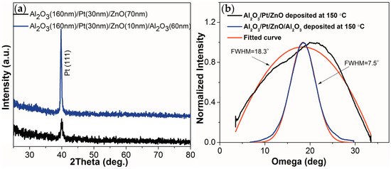 (a) θ–2θ XRD (X-ray diffraction) scans of the Al2O3/Pt/ZnO/Al2O3/LGS and Al2O3/Pt/ZnO/LGS samples; (b) Omega XRD scans of the Al2O3/Pt/ZnO/Al2O3/LGS and Al2O3/Pt/ZnO/LGS samples.