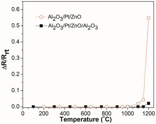 Relative resistance change for the Al2O3/Pt/ZnO/Al2O3/LGS and Al2O3/Pt/ZnO/LGS samples as a function of temperature from room temperature to 1200 °C.