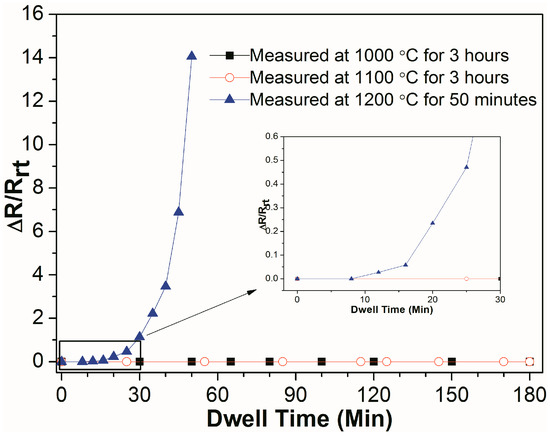 Relative resistance change of Al2O3/Pt/ZnO/Al2O3/LGS sample as a function of dwell time at 1000, 1100, and 1200 °C. The inset shows the enlarged figure of the relative resistance change curves before 30 min.