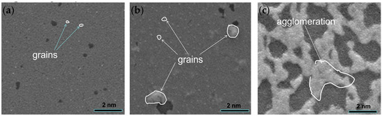 Figure 8 shows the surface topography of Al2O3/Pt/ZnO/Al2O3/LGS samples after high temperature resistance measurements at 1000, 1100, and 1200 °C, respectively. From Figure 8, we can see that the surface is smooth with few and small grains (marked out by curves) after resistance measurements at 1000 °C for 3 h, indicating that the film agglomerated slightly. Figure 8b shows the surface topography of Al2O3/Pt/ZnO/Al2O3/LGS sample after resistance measurement at 1100 °C for 3 h. The surface was still smooth but we can observe more and bigger grains. It shows that more severe agglomerations occurred after 1100 °C resistance measurement. However, these agglomerations are both not sufficient to increase the film resistance greatly as shown in Figure 7. Finally, it can be seen from Figure 8c that much more severe agglomeration occurred after the resistance measurement at 1200 °C for 25 min, which is similar to other film electrodes after high temperature measurements [18,19,20].