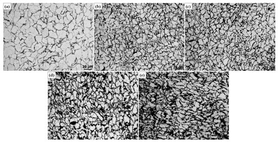 OM (optical microscope) graph of the as-extruded AZ31 and its nanocomposites: (a) AZ31, (b) AZ31-0.5 wt. % CNTs (Carbon nanotubes), (c) AZ31-1.0 wt. % CNTs, (d) AZ31-2.0 wt. % CNTs, (e) AZ31 wt. % CNTs.
