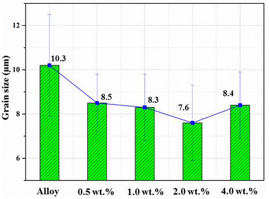 Figure 3 illustrates the OM graphs of the as-extruded AZ31 matrix and its nanocomposites, and Figure 4 shows the average grain size of the matrix and composites with different weight percentages. Adding CNTs to the matrix had a marginal grain refinement effect (about 20% reduction) in this study. Besides, with an increase of the amount of CNTs from 0.5 wt. % to 2.0 wt. %, the grain size of the composites gradually decreased, but the reduction degree was pretty limited. The refinement of grains can be attributed to two reasons: (a) the larger strain due to the addition of CNTs in the particle bands can promote the occurrence of dynamic recrystallization (DRX) during the extrusion; (b) CNTs distributing on the grain boundaries can significantly inhibit the grain boundaries’ migration during the sintering and extrusion processes [21]. However, with a further increase of the content of CNTs up to 4.0 wt. %, a large black area can be observed on the grain boundaries, which may be attributed to the clusters of CNTs [20]. Besides, the clusters of CNTs not only slightly compensate for the refinement of grains on the matrices, they also impede the densification of the composites, resulting in the deterioration of the mechanical properties of the composites [20].