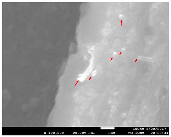 Figure 5 shows a SEM image of homogeneously dispersed CNTs in the as-extruded composite with the addition of 1 wt. % CNTs. Individual CNTs (red arrows) were observed, and the clusters were not observed, which indicates that the CNTs distributed uniformly in the composites. Therefore, this method can fabricate magnesium matrix nanocomposites with uniform CNTs.