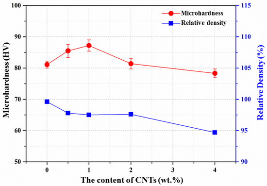 Curves of microhardness and relative density with the addition of varying amounts of CNTs.