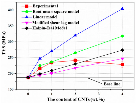 However, some other factors, such as the CNTs’ distribution, texture, interfacial bonding, and porosity in composites fabricated by a powder metallurgy method, will influence the strength of the composites significantly, and thus should also be taken into account.