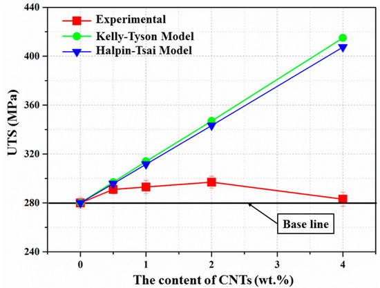 All of the variables are the same as defined above. From Equation (9), the calculated lc in this work is about 4.3 μm, and the average length of the CNTs used in this study is 1.25 μm, indicating that the calculated stress on the CNTs cannot reach the fracture strength of the CNTs, and Equation (8) can be used to predict the strength of the composites. The theoretically predicted and experimentally obtained tensile strength of the composites are shown in Figure 9. It can be observed that the theoretical values are in good agreement with the experimental values at low CNT content; however, the discrepancies increase as the amount of CNTs incresae. This may be caused by the agglomerations of the CNTs, which influence load transfer significantly. Besides, the Halpin–Tsai model was also employed to calculate the theoretical tensile strength of the composites, and it presents nearly the same trend as the Kelly–Tyson model.