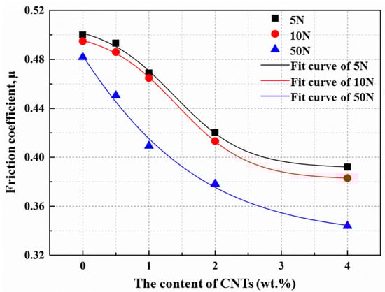 Regression equations of the friction coefficient versus the content of CNTs (wt. %).