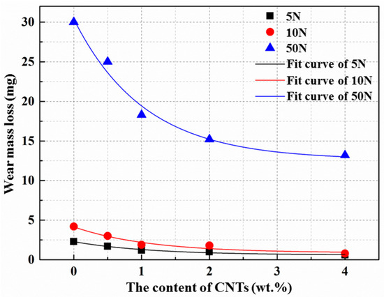 Figure 12 illustrates the effect of the amount of CNTs on the wear mass loss of the as-extruded AZ31 matrix at different loads. It can be observed that the weight loss of the composites decreases with as the amount of CNTs increases, and increases significantly with the increase of applied load values in this work. The decrease in the weight loss can be attributed to two main reasons: (i) the addition of CNTs can enhance and improve the hardness and strength of the matrix, which can improve its plastic deformation resistance and weaken the ploughing effect of the counter material on the matrix, leading to a lower weight loss; (ii) the self-lubrication effect of CNTs corresponds to a lower friction coefficient of the composites in the matrix, which can also help decrease the weight loss [50]. As for the influence of the load, the ploughing effect increases with the increase of the load value, leading to the increase of the weight loss. Further, the reduction level of the weight loss at high load conditions is much higher than that at low load conditions, which indicates that CNTs play a more significant role in reducing the weight loss for the composites at a high-applied load level. This may be because more pulled-out CNTs can be brought into the friction surface due to a higher ploughing force at higher load conditions, resulting in a better weight loss reduction effect. Besides, the weight loss of the composites gradually becomes stable when the addition of CNTs exceeds 2.0 wt. %, which may be caused by the formation of the agglomerations of CNTs and more pores. These agglomerations and pores can not only weaken the strengthening effect, they can also reduce the self-lubrication effect. What’s more, according to the distribution of the points in Figure 12, the exponential decay model was adopted to fit the curves of the friction coefficient versus the content of CNTs, and the R-Square of the regression equations (as shown in Table 6) are nearly 0.97, which means that this model can be used to predict weight loss during the CNTs content range between 0.0 to 4.0 wt. % in this work.