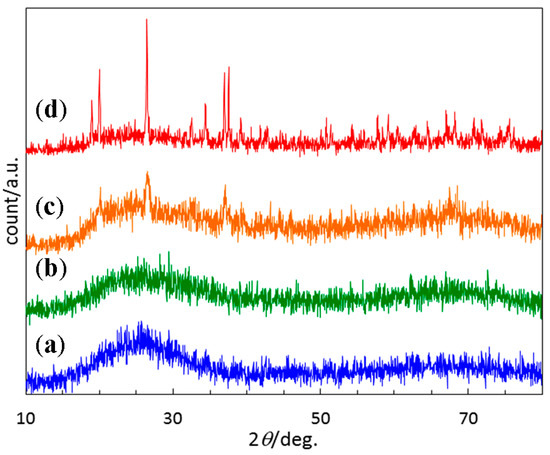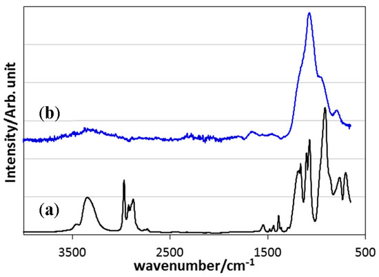 In the ATR-IR spectrum for the sample after pyrolysis at 800 °C in N2 (Figure 1), the characteristic peaks due to the organic substituents disappeared and the spectrum was similar to that of silica composed of a weak and broad band at 3000–3700 cm−1 and a strong band centered around 1010 cm−1 assigned to intermolecular hydrogen-bonded Si–OH groups and νas Si–O in Si–O–Si linkage [27,28].