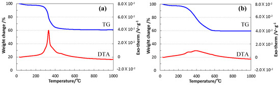 In air (Figure 3a), the sample showed a slight weight loss of approximately 2.5% up to 200 °C, which could be due to the residual solvent. Then, a main weight loss was observed at around 300 to 600 °C, with a distinct exothermic peak that was centered at 321 °C, typical for the combustion of organic molecules. The final recovery rate (ceramic yield) at 1000 °C was 60%. This yield was assumed to be recognized as a result of the combustion of organic substituents and subsequent oxidation of Si atom in the EtOSZ to yield silica (Equation (3)), since the observed mass loss was consistent with the weight difference between the molecular unit of EtOSZ (CH3CH2OSi(NH)1.5) and the molecular weight of silica (SiO2).
