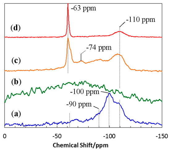 One broad peak at around −100 ppm was deconvoluted to three broad peaks centered at −110, −100, and −90 ppm that were assigned to silicon tetrahedral units of SiO4 [29], HO–SiO3 (Q3) [30], and SiO3N [31,32], respectively.